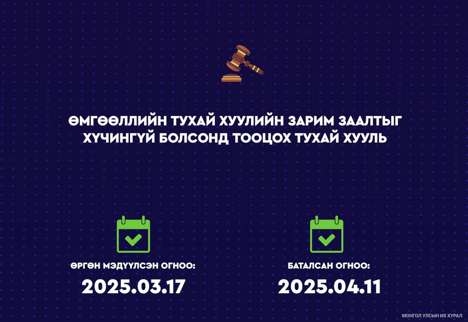 Өмгөөллийн тухай хуулийн зарим заалтыг хүчингүй болсонд тооцох тухай хууль 2025 оны 04 дүгээр сарын 11-ний өдрөөс хэрэгжиж байна хэмээн Улсын Их Хурлын Хэвлэл мэдээллийн газраас мэдээллээ.