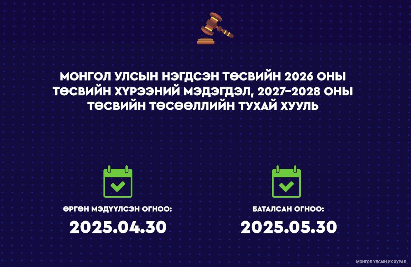 Монгол Улсын Засгийн газраас Монгол Улсын нэгдсэн төсвийн 2026 оны төсвийн хүрээний мэдэгдэл, 2027-2028 оны төсвийн төсөөллийн тухай хуулийн төсөл болон “Засгийн газрын өрийн удирдлагын 2026-2028 оны стратегийн баримт бичиг батлах тухай” Улсын Их Хурлын тогтоолын төслийг 2025 оны 04 дүгээр сарын 30-ны өдөр Улсын Их Хуралд өргөн мэдүүлснийг Улсын Их Хурал хэлэлцээд, 2025 оны 05 дугаар сарын 30-ны өдөр баталсан юм.