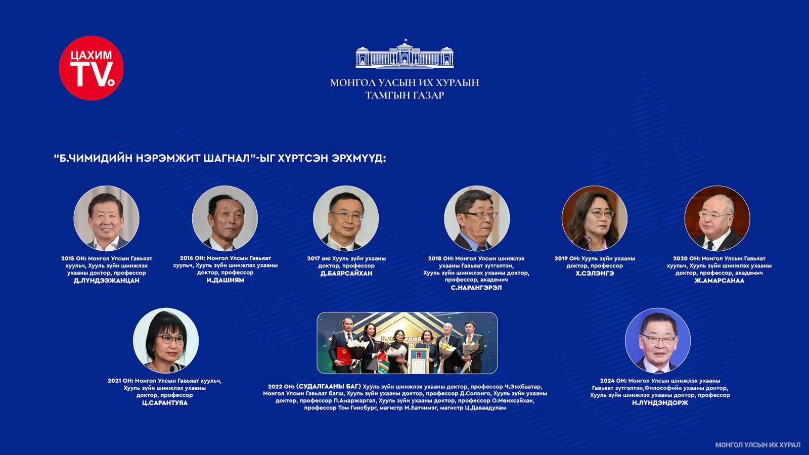 Ардчилсан Үндсэн хуулийн эхийг баригч, Монгол Улсын Хөдөлмөрийн баатар, Ардын багш, Гавьяат хуульч, доктор, профессор “Бяраагийн Чимидийн нэрэмжит шагнал”-ын 12 дахь удаагийн шалгаруулалтыг зохион байгуулахаар бэлтгэж байна.