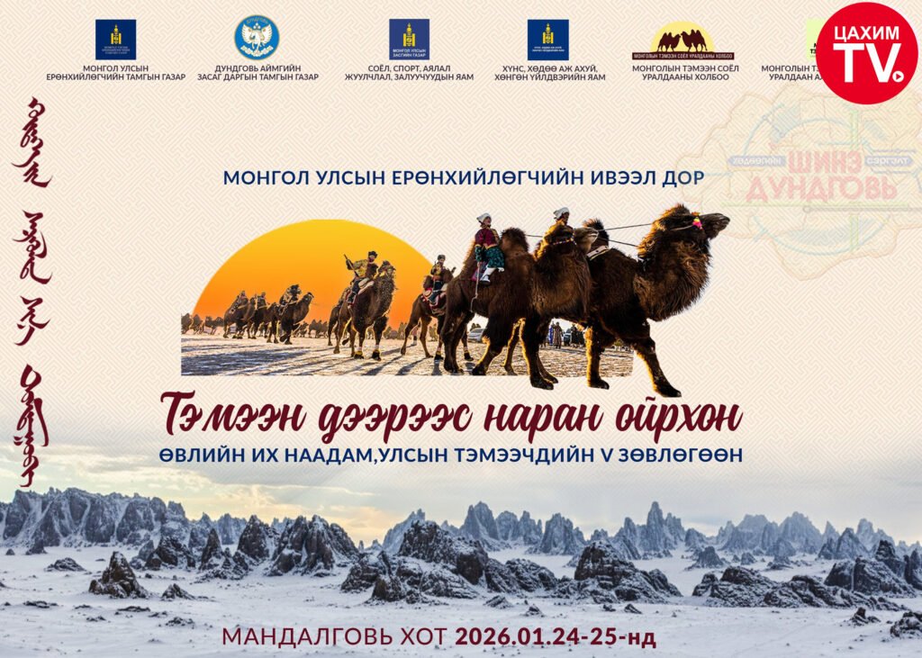 Монгол Улсын Ерөнхийлөгчийн ивээл дор “Тэмээн дээрээс наран ойрхон” Өвлийн их наадам, Тэмээчдийн V зөвлөгөөнийг 2026 оны нэгдүгээр сарын 24-25-нд Дундговь аймгийн Мандалговь хотноо зохион байгуулах гэж байна.