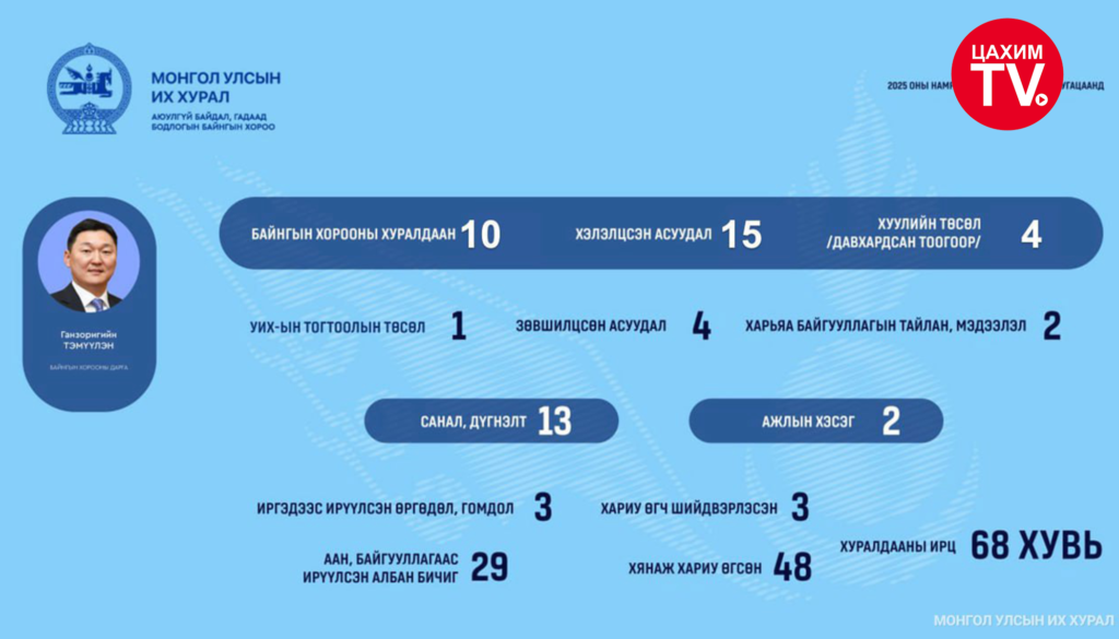 Байнгын хороо хуралдаанаараа Гадаад зээл, тусламжийн хэрэгжилт, нөхцөл байдлын талаарх Сангийн сайдын, Эрчим хүчний салбарын өнөөгийн байдал, эрчим хүчний аюулгүй байдлыг хангахад чиглэсэн бодлого, арга хэмжээ, төсөл, хөтөлбөрийн хэрэгжилт, үр дүн, хариуцлагын талаарх Эрчим хүчний сайдын мэдээллийг тус тус сонсож, хууль тогтоох, хянан шалгах үйл ажиллагаанд иргэд, сонгогчид, иргэний нийгмийн байгууллагуудын оролцоог хангах, иргэдээс санал авахад дэвшилтэт арга хэрэгслийг ашиглах эрх зүйн орчныг боловсронгуй болгох арга хэмжээний хүрээнд өргөн мэдүүлсэн, ирүүлсэн хууль тогтоомжийн төслийг D-PARLIAMENT цахим сүлжээнд оруулан, иргэдийн саналыг авчээ.