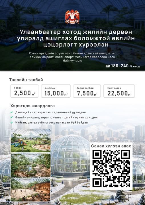 Нийслэлийн иргэдийн эрүүл мэндийг дэмжих, идэвхтэй амьдралын хэв маягийг төлөвшүүлэх, нийтийн амралт, чөлөөт цагийн орчны хүртээмжийг нэмэгдүүлэх зорилтын хүрээнд жилийн дөрвөн улиралд ашиглах боломжтой өвлийн цэцэрлэгт хүрээлэн байгуулах асуудлыг холбогдох байгууллагууд судалж, төлөвлөлтийн шатны ажлыг хэрэгжүүлж байна.