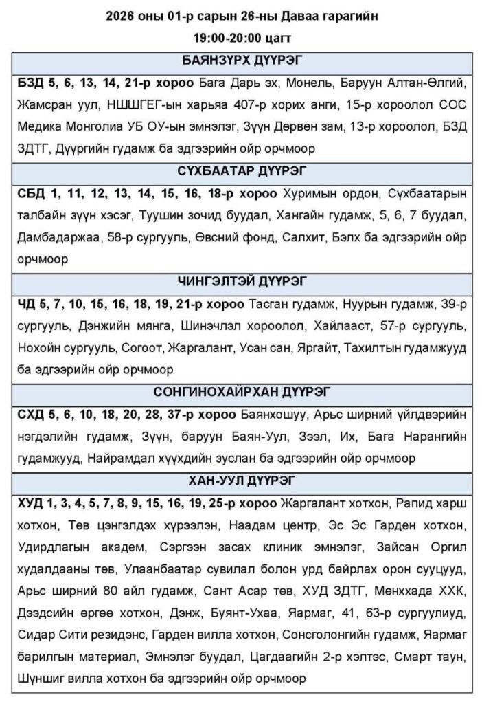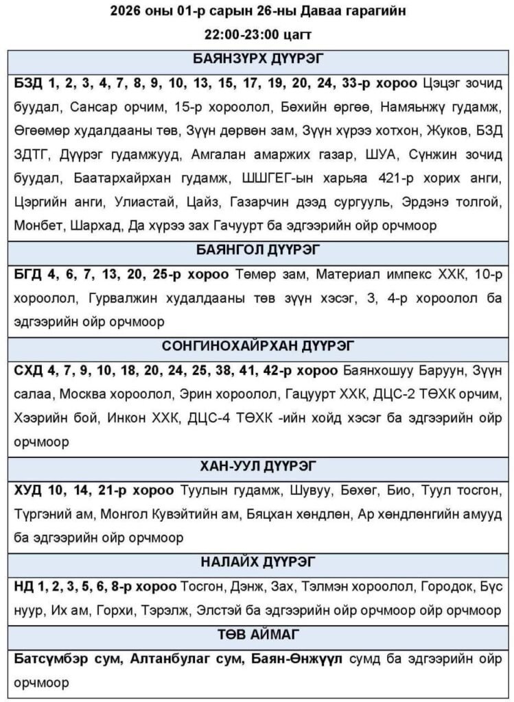 Эрчим хүчний системд аваарын горим үүсэхээс сэргийлэн нэгдсэн сүлжээнд холбогддог тодорхой байршлуудад өнөөдөр цахилгаан эрчим хүчний төлөвлөсөн хэрэглээг “Диспетчерийн үндэсний төв” ТӨХХК-ийн шийдвэрээр хуваарийн дагуу 1-ээс 1 цаг 30 минутын хугацаатайгаар хязгаарлах арга хэмжээ авч болзошгүй байна