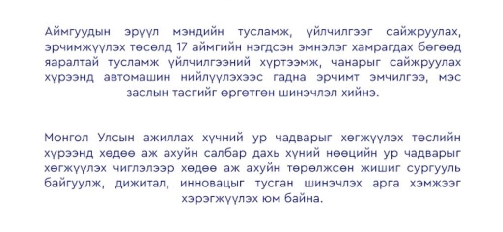 UncategorizedСанхүүжилтийн ерөнхий хөтөлбөр”-ийн хүрээнд “Аймгуудын эрүүл мэндийн тусламж, үйлчилгээг сайжруулах, эрчимжүүлэх төсөл”, “Эдийн засгийн хүндрэлийн үед боловсролын чанар хүртээмжийг сайжруулах төсөл-2 дахь нэмэлт санхүүжилт”, “Монгол Улсын ажиллах хүчний ур чадварыг хөгжүүлэх төсөл”, “Монгол Улсын гамшгийг сөрөн тэсвэрлэх чадавхыг бэхжүүлэх төсөл” хөтөлбөрүүдийг хэрэгжүүлнэ.01/27/202601/27/2026